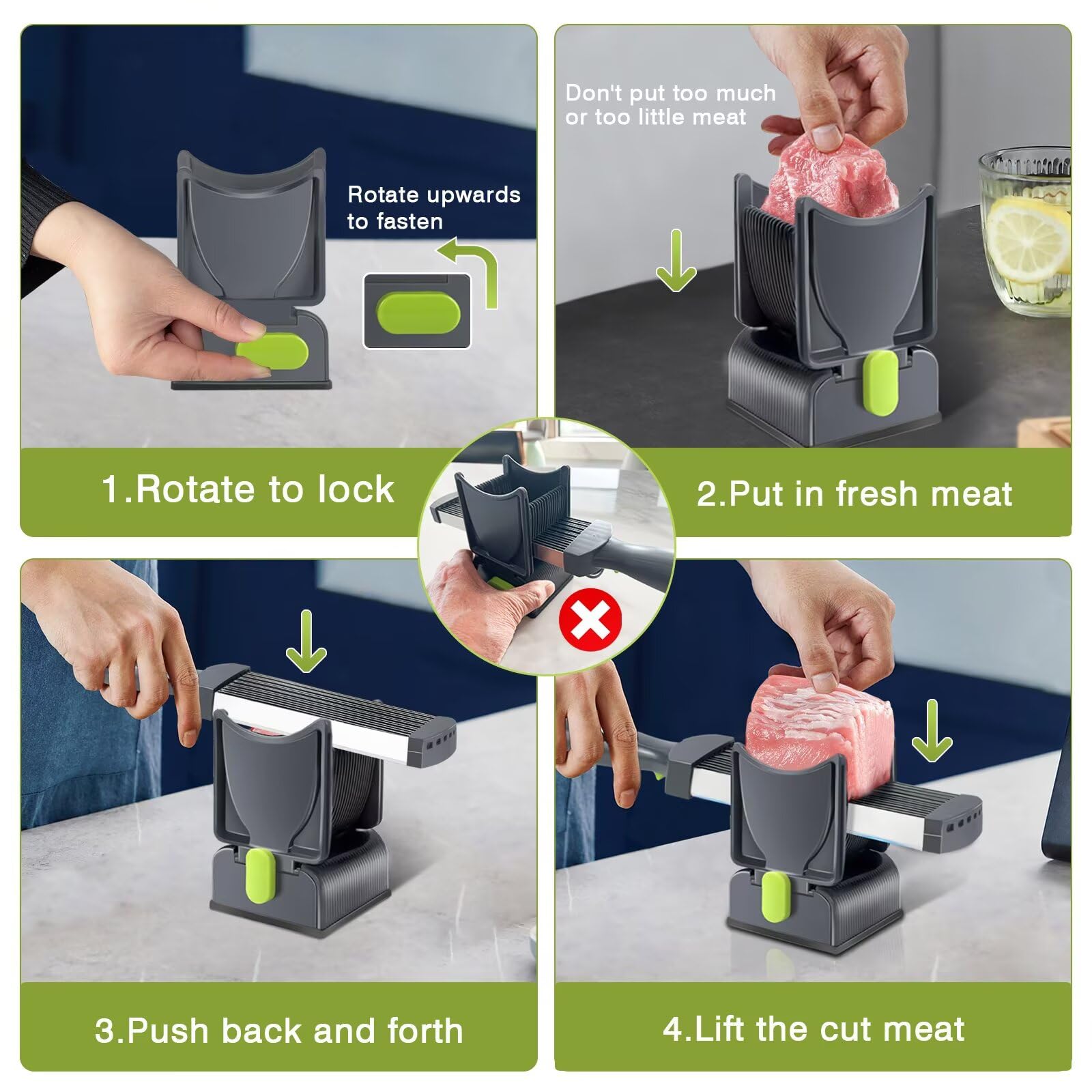 - Fresh Meat Slicer Manual: not suitable for frozen, cooked or bone-in meat. Manual meat slicer is designed for fresh boneless meat, no need to freeze the meat hard first, such as fresh chicken breast, pork, beef, lamb, salmon, etc. The manual fresh meat cutter can easily slice and shred the meat evenly and save a lot of time, keep caution when using thin meat slicer, the blades are very sharp, please don't touch it with your hands