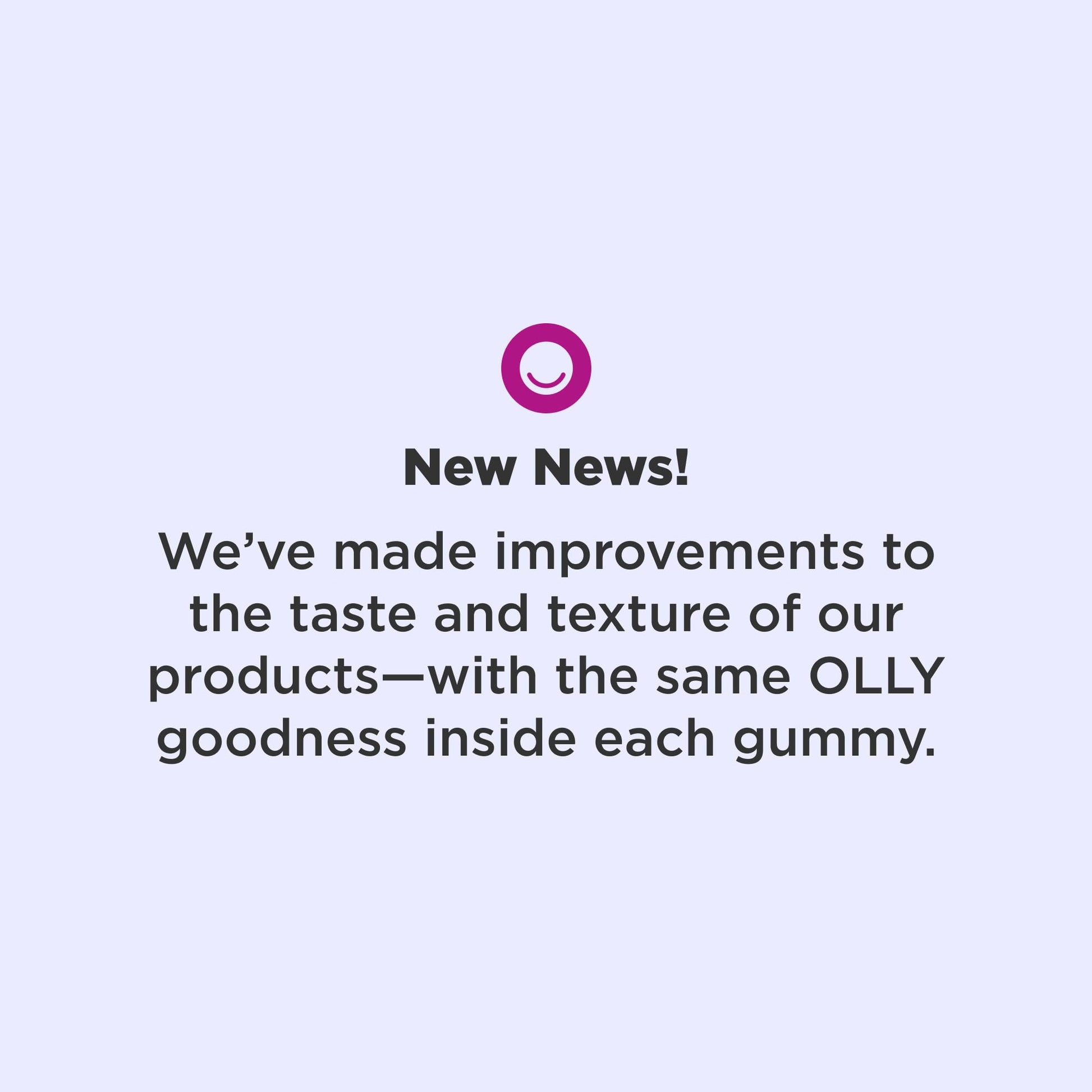 - NEW NEWS: We’ve made improvements to the taste and texture of our products—with the same OLLY goodness inside each gummy