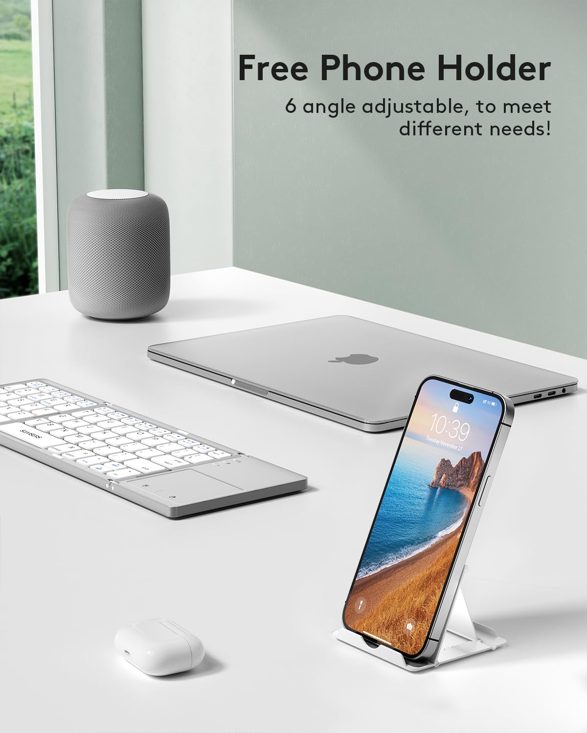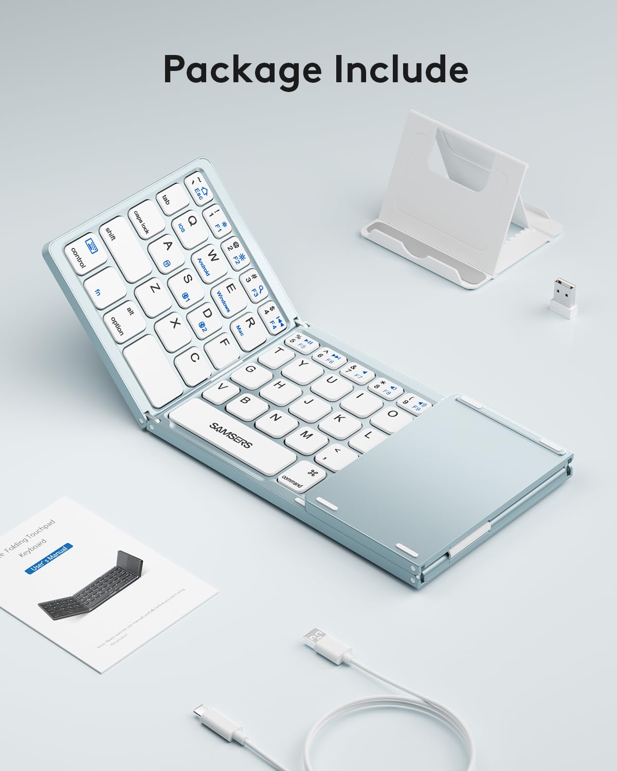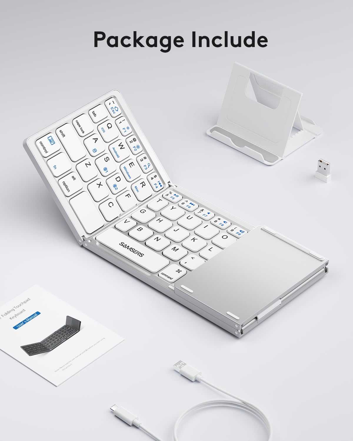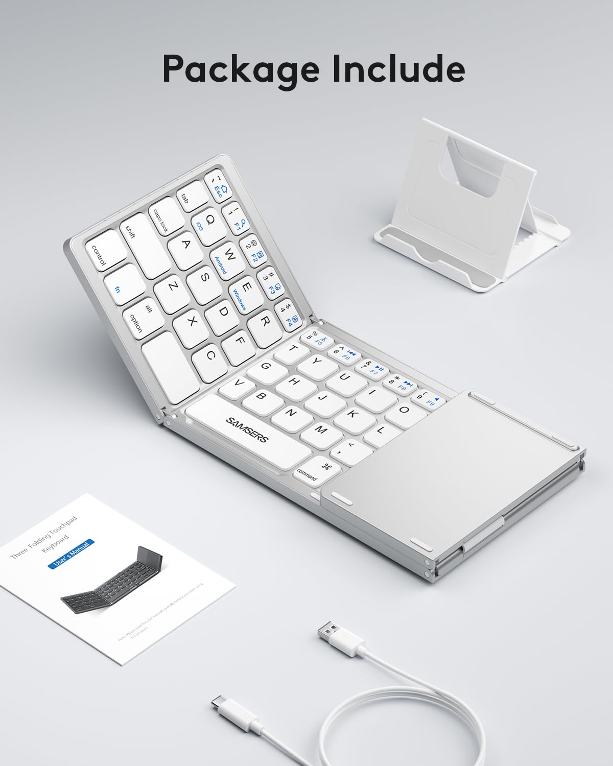 - 【Folding Bluetooth Keyboard & Phone Stand Holder】Extremely thin design of the portable folding keyboard allows you to fold it up and put it in your pocket or bag without taking up too much space. The phone stand holder, best companion for folding keyboard, gives you perfect screen angle. Near-standard size design provides accurate, fast typing, just like the desktop keyboard you are used to. Quiet keys allow you to focus on your work. Perfect gift for travel and business trips!