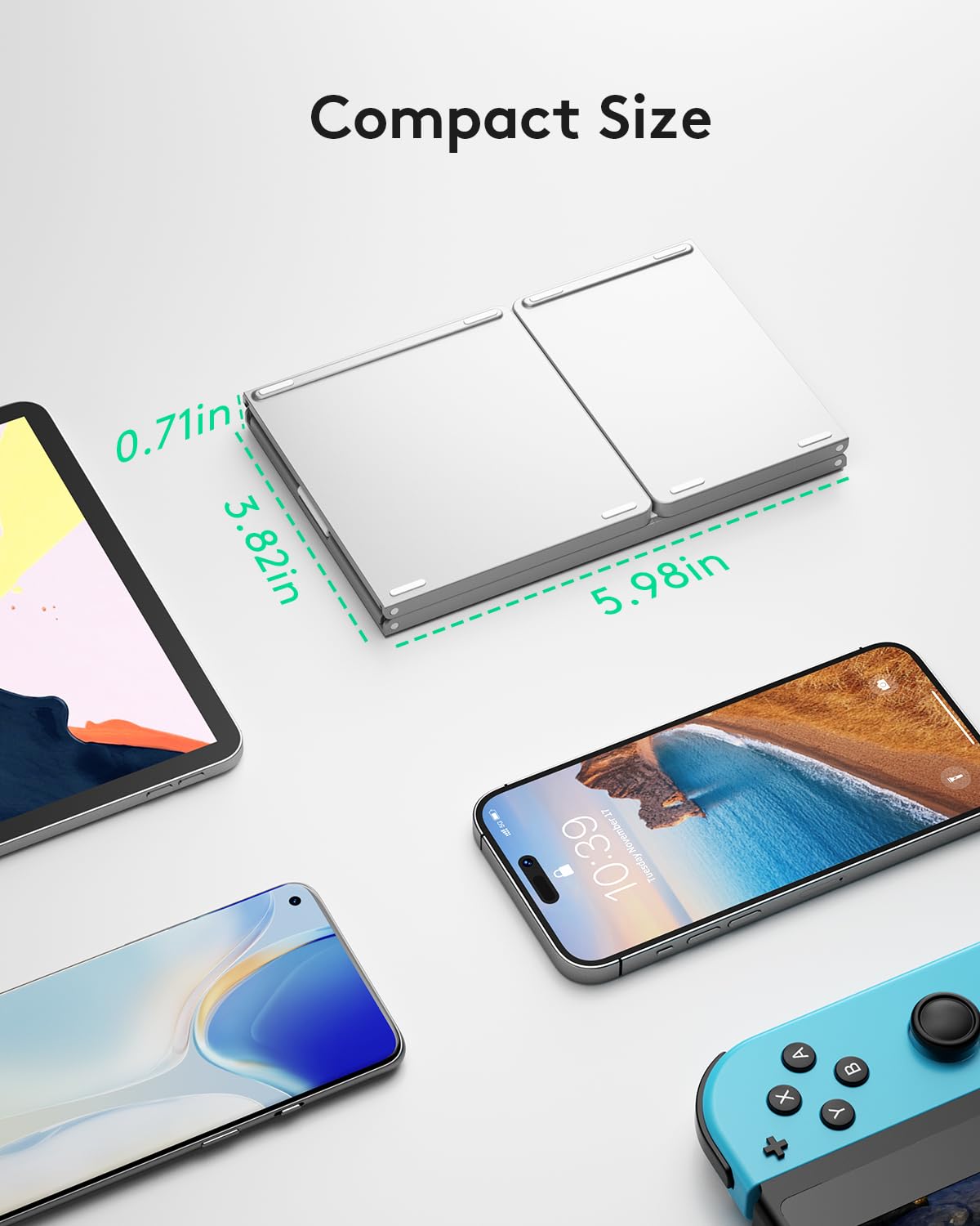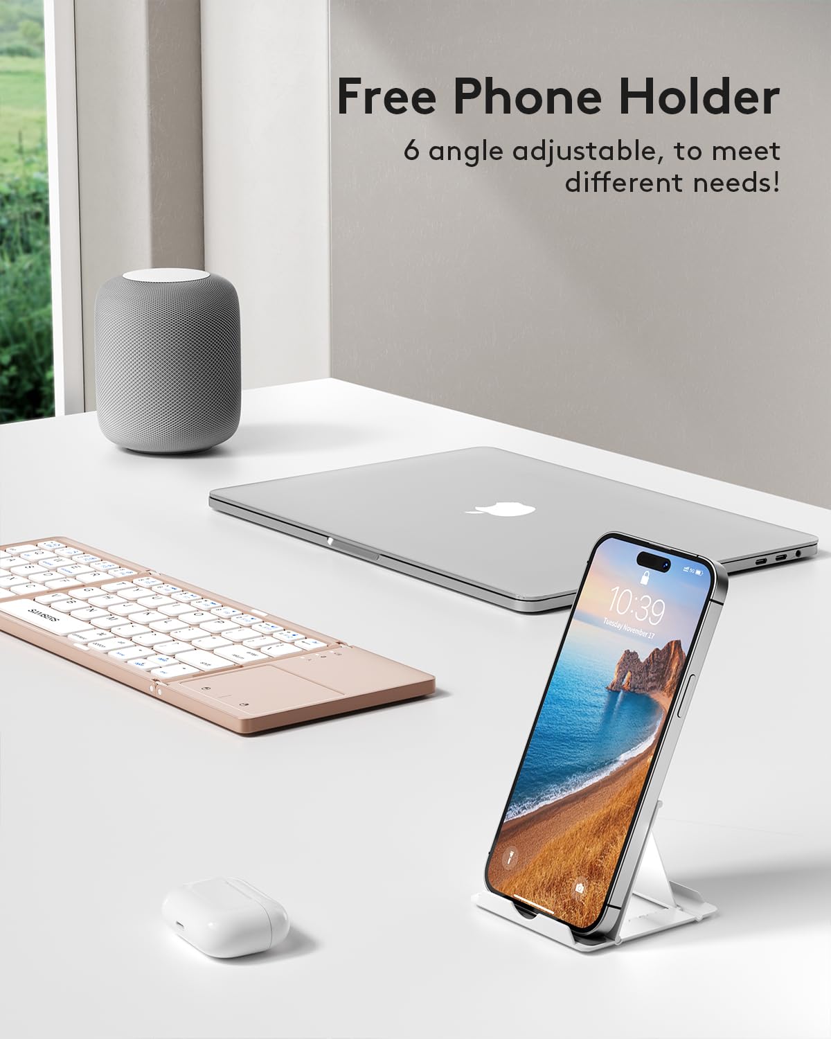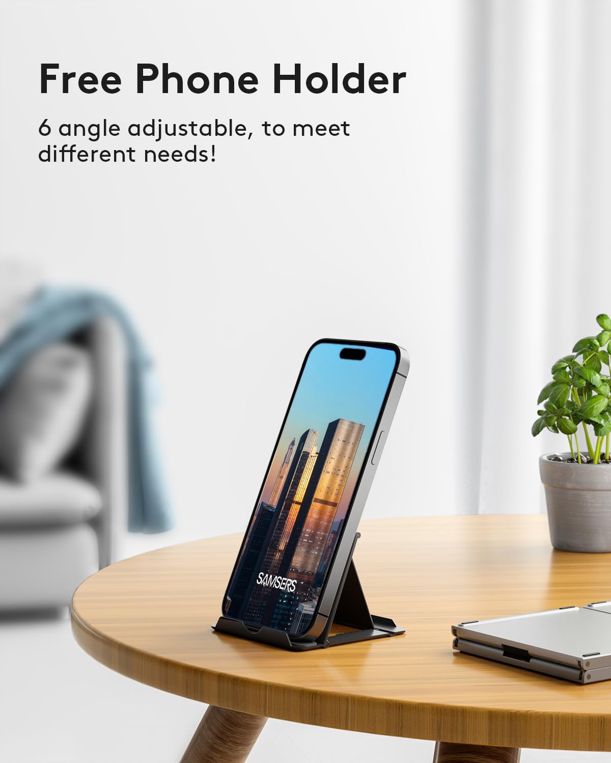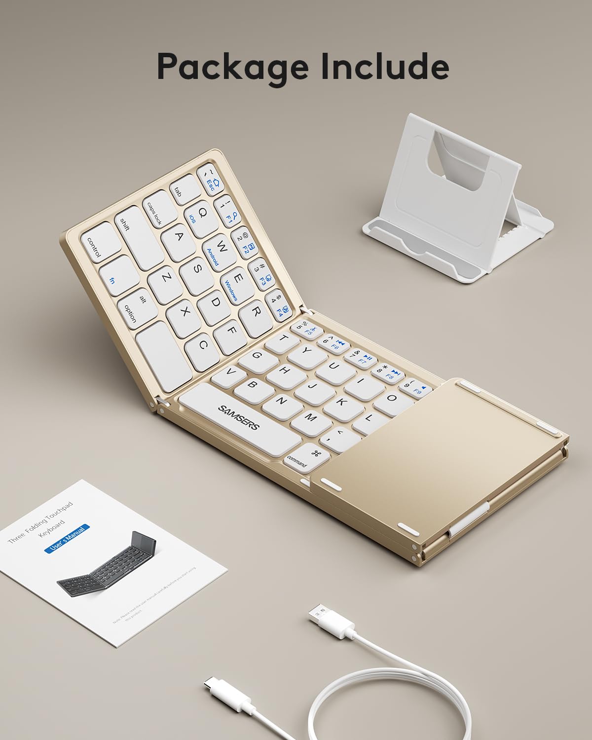 - 【Folding Bluetooth Keyboard & Phone Stand Holder】Extremely thin design of the portable folding keyboard allows you to fold it up and put it in your pocket or bag without taking up too much space. The phone stand holder, best companion for folding keyboard, gives you perfect screen angle. Near-standard size design provides accurate, fast typing, just like the desktop keyboard you are used to. Quiet keys allow you to focus on your work. Perfect gift for travel and business trips!