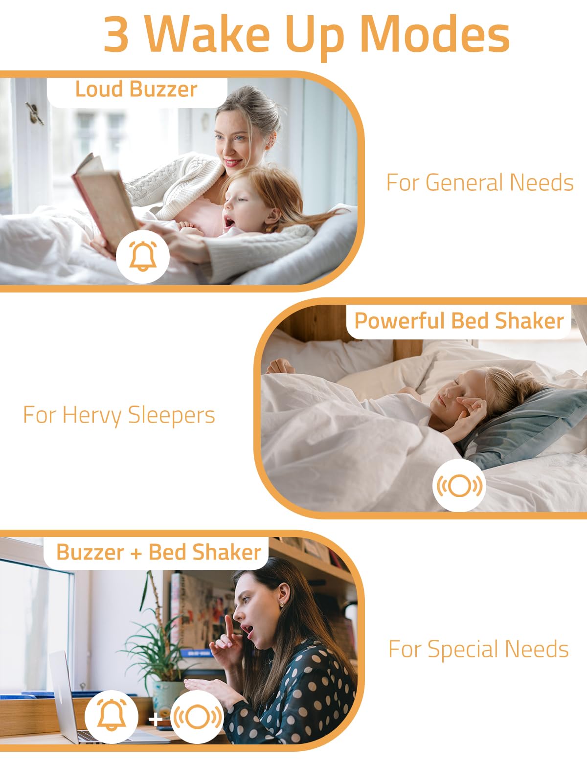 - 💥 【3 Wake-Up Modes for Heavy Sleepers】Struggle to wake up? Choose buzzer, vibration, or both—plus a powerful bed shaker and 3 adjustable volumes. Perfect for deep sleepers, seniors, or the hearing impaired.